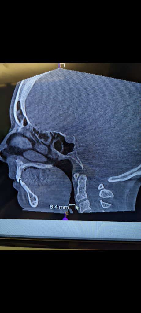 The CT scan measured my airway at 8.4 MM. Average female pharynx is 33 MM.